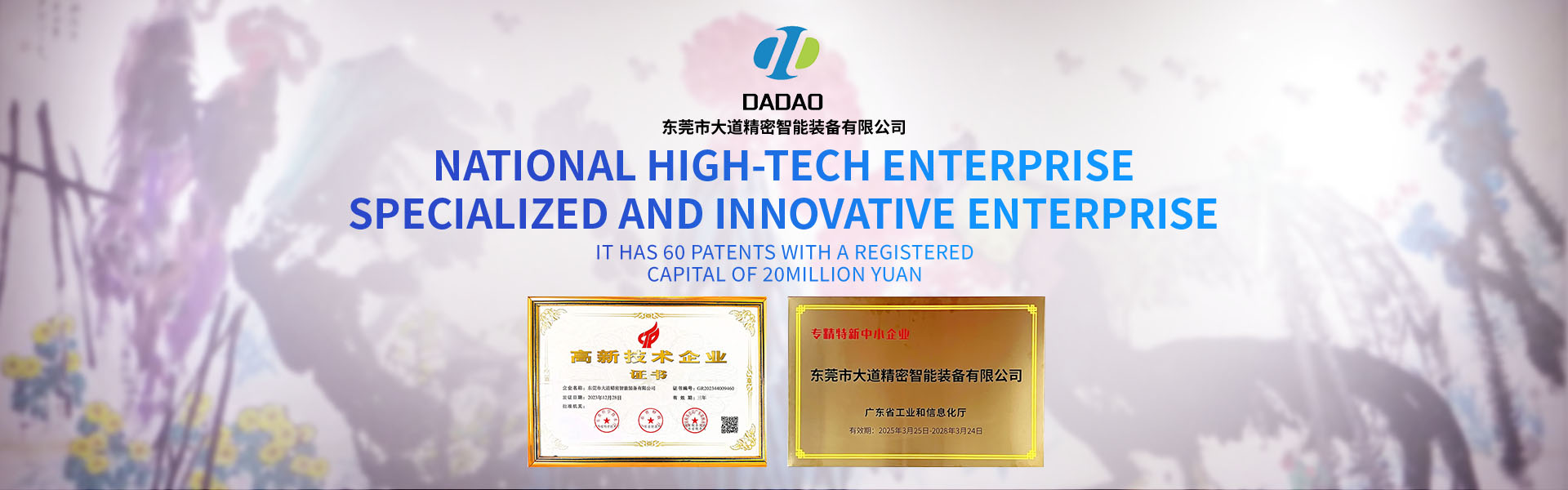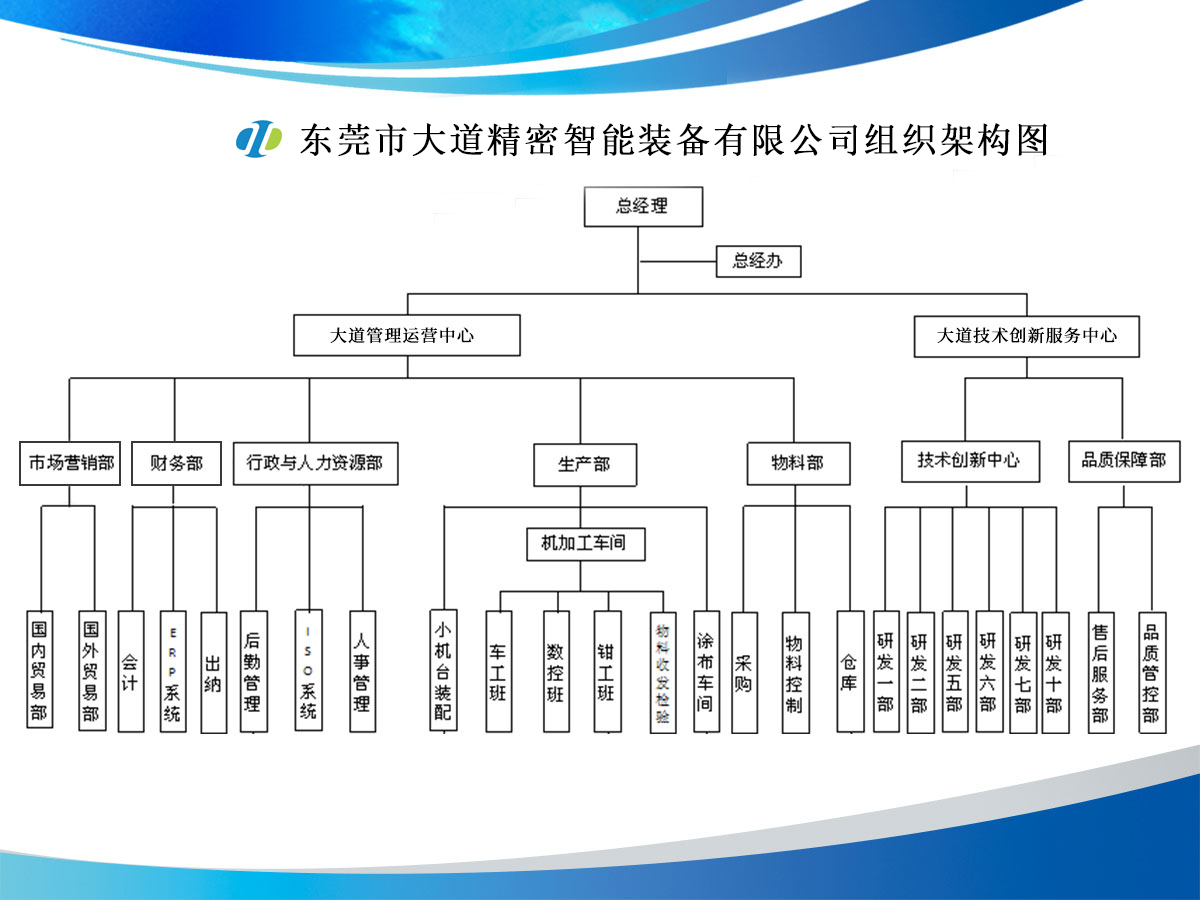 大道精密成立于2019年,公司注冊資本1000萬元,擁有辦公室、廠房等18,000多平方米。已通過ISO9001:2015國際質(zhì)量管理體系認證,擁有國家各類專利共計58項,獲得“中國大道.商標”和“一帶一路十周年 .國禮品牌”等榮譽稱號,屬于國家高新技術(shù)企業(yè),專精特新中小企業(yè)。2023年4月成立了“東莞市大道精密智能裝備有限公司關(guān)心下一代工作委員會”,是東莞市企石鎮(zhèn)工商聯(lián)副會長單位、東莞市企石鎮(zhèn)文學(xué)藝術(shù)界聯(lián)合會副主席單位、東莞市環(huán)保包裝行業(yè)協(xié)會副會長單位、東莞市數(shù)控裝備行業(yè)協(xié)會第二屆會長單位、廣東省包裝技術(shù)協(xié)會常務(wù)理事單位、廣東省膠粘劑行業(yè)協(xié)會理事單位、國家標準《機械安全中安全防護授權(quán)系統(tǒng)的基本要求》起草單位。